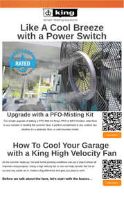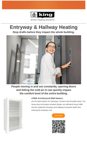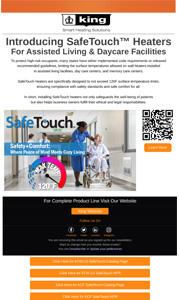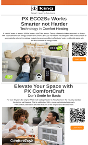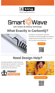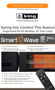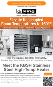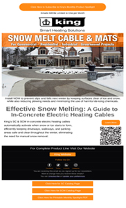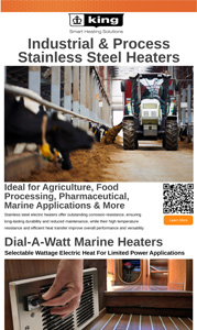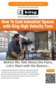 Monthly Product Spotlight Spotlight: Upgrade to a Heat Pump without Ditching Your Existing Electric Heaters Product Spotlight, 08/04/2025 Spotlight: How to Cool Industrial Spaces w/King High Velocity Fans Product Spotlight, 07/07/2025 Spotlight: Elevate Unoccupied Room Temperatures to 160F Product Spotlight, 06/02/2025 Spotlight: Freeze Protection Heaters in UnOccupied & Concealed Spaces Product Spotlight, 05/05/2025 Spotlight: Snowmelt Cables & Mats Product Spotlight, 04/07/2025 Spotlight: Spring Into Comfort This Season Product Spotlight, 03/03/2025 Spotlight: Comprehensive Electric Heating Solutions for Industrial Space Product Spotlight, 02/03/2025 Spotlight: Comprehensive Electric Heating Solutions for Every Space Product Spotlight, 12/02/2024 Spotlight: Electric Heating Solutions for Modern Agriculture Product Spotlight, 11/04/2024 Spotlight: Why Use Hydronic In-Wall Heaters? Product Spotlight, 10/07/2024 Spotlight: 5 Top Tips for Winter Product Spotlight, 9/09/2024 Spotlight: SR Heating Cable Product Spotlight, 8/05/2024 Spotlight: Stainless Steel Heaters Product Spotlight, 7/01/2024 Spotlight: High Velocity Fans Product Spotlight, 6/03/2024 Spotlight: Property Management Thermostats Product Spotlight, 5/06/2024 Spotlight: Introducing SafeTouch Heaters Product Spotlight, 3/04/2024 Spotlight: SmartWave Outdoor Heating Product Spotlight, 2/05/2024 Spotlight: Industrial Portable Heaters Product Spotlight, 1/01/2024 Spotlight: Big Heat For Large Spaces Product Spotlight, 12/01/2023 Spotlight: Small Fan Heaters Product Spotlight, 11/01/2023 Spotlight: Line Voltage Thermostats Product Spotlight, 10/01/2023 Spotlight: Pipe & Gutter Freeze Product Spotlight, 9/01/2023 Spotlight: Garage Heaters Product Spotlight, 8/01/2023 Spotlight: High Velocity Fans Product Spotlight, 7/01/2023 Spotlight: Cove Heaters Product Spotlight, 6/01/2023 Spotlight: Entryway & Hallway Heating Product Spotlight, 5/01/2023 Spotlight: SmartWave Radiant Heaters Product Spotlight, 4/01/2023
