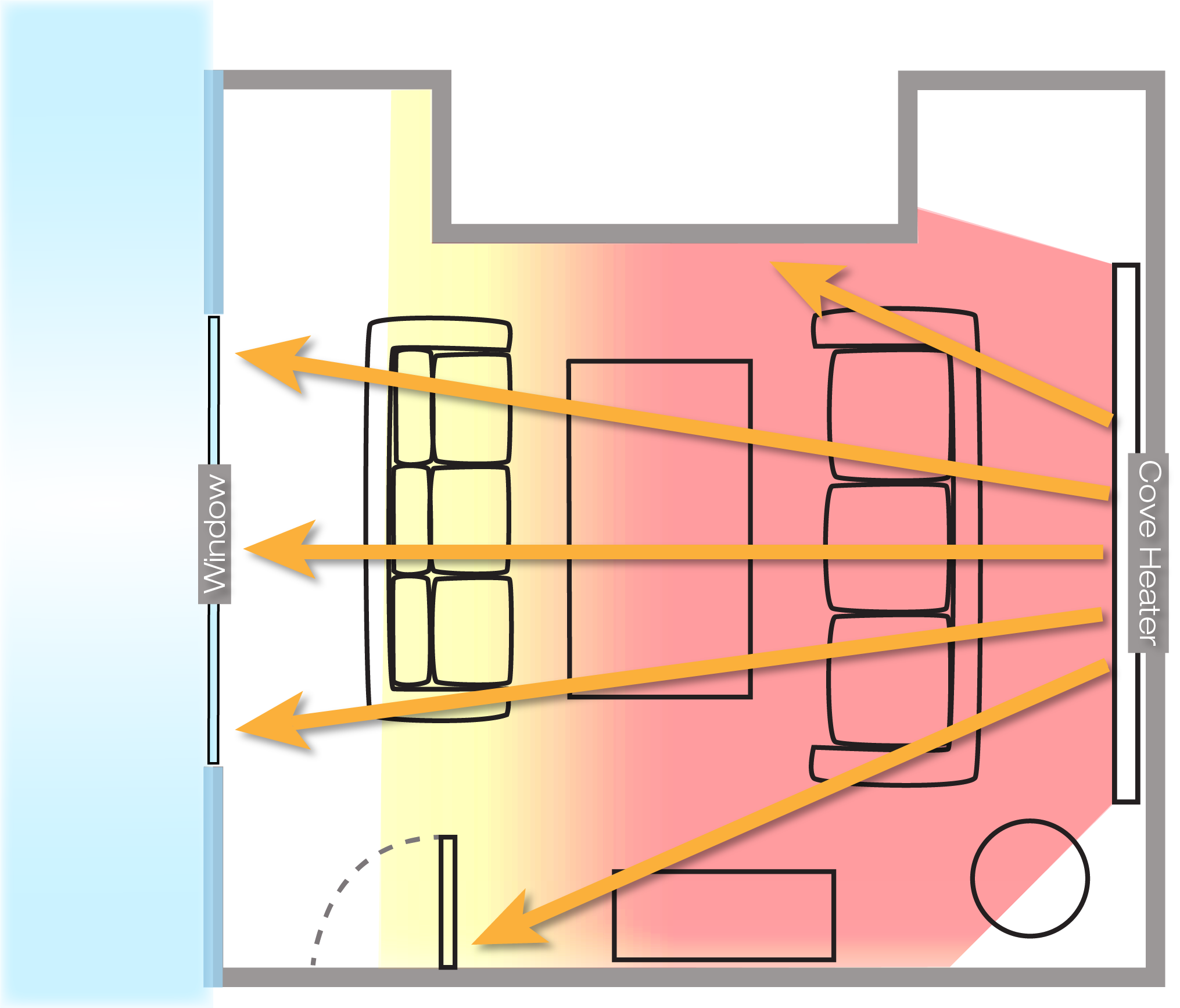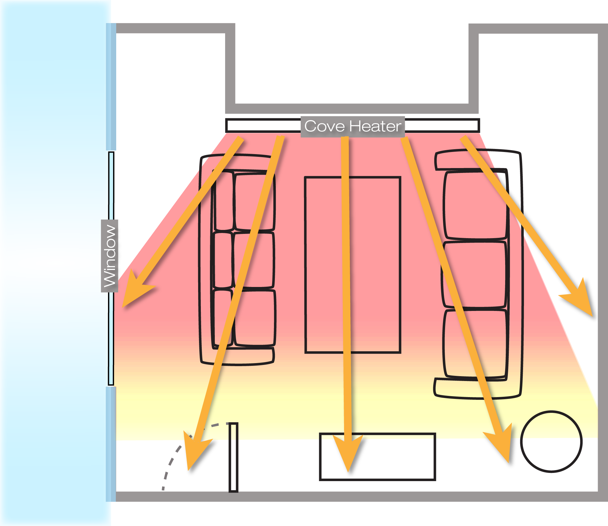 In the above image, a larger cove heater is placed on the wall above the sofa and is pointing toward the large window on the outside wall. The cover heater has more freedom to spread its heat and will cover a much greater area of the room but this positioning does have its drawbacks. Less heat will reach the sofa furthest from the wall, creating a greater disparity in temperature between the two seating areas. Furthermore, there are some schools of thought that advise against positioning cove heaters toward widows.