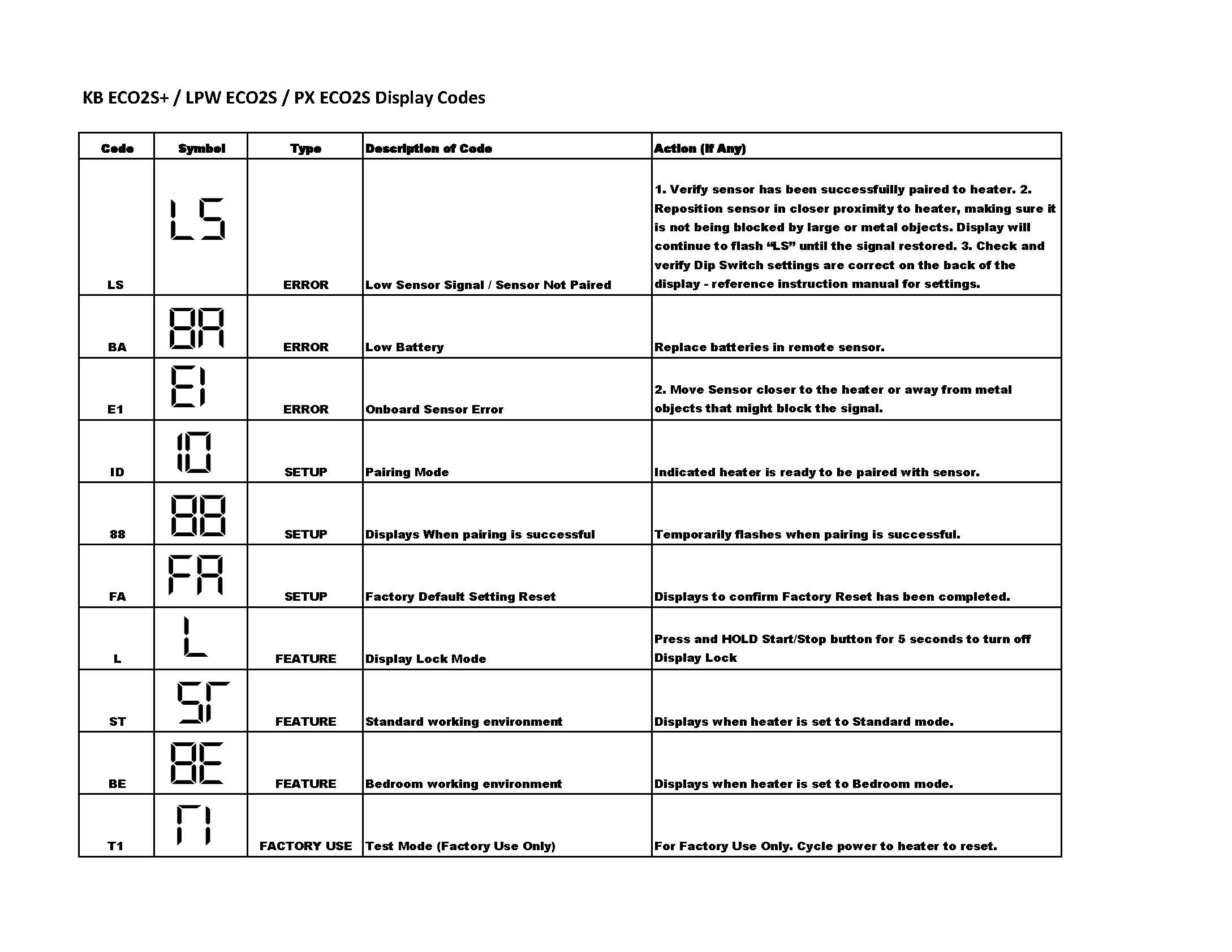 ECO2S Support – Error Codes – Troubleshooting Troubleshooting tips for display error codes for KB ECO2S+, LPW ECO2S and PX ECO2S heaters. Related Articles ECO2S Support Home Page Pairing A Sensor How To Pair Sensor with PX ECO2S How To Pair Sensor with LPW ECO2S How To Pair Sensor with KB ECO2S+ Setup For 1-Stage Heating How To Setup an ECO2S Heater as a 1-Stage Heater Error Codes Error Codes – Troubleshooting Can’t find your answer in our support center? Contact us directly.