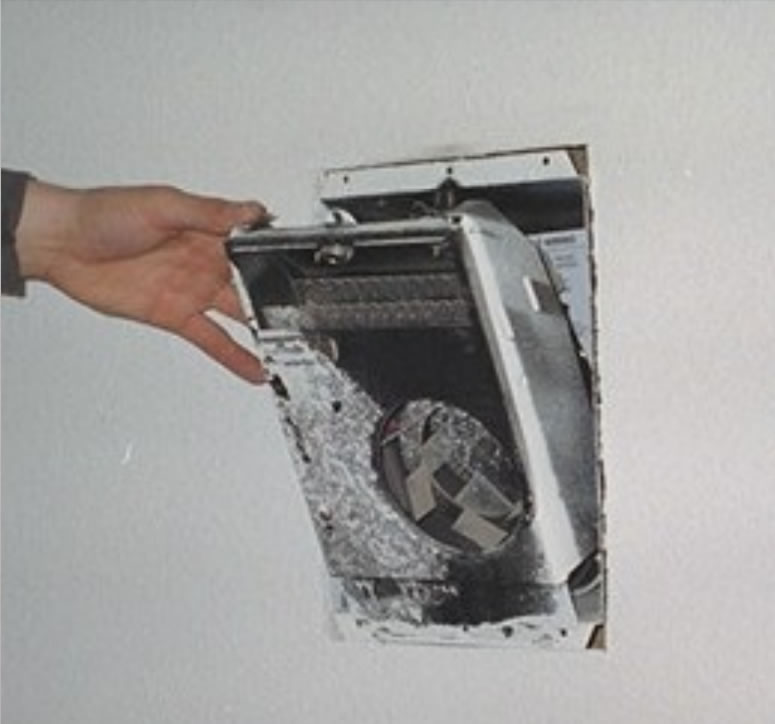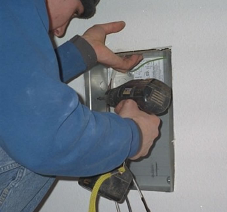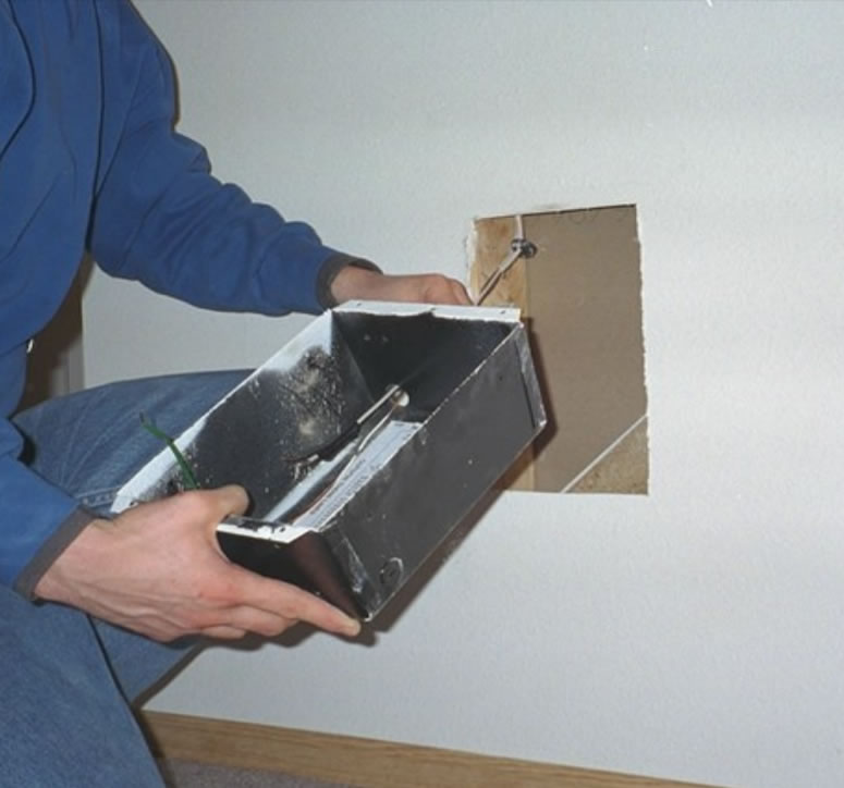 Apply power wires with grommet and ground wall box. Insert into wall leaving 1/2 inch