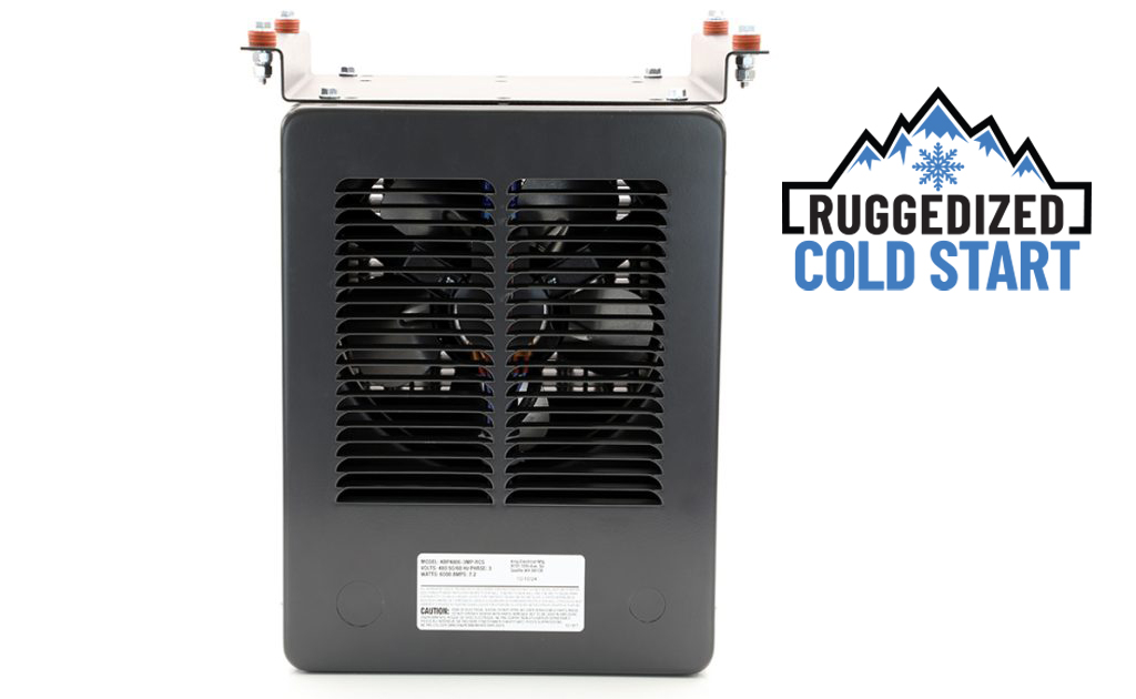 The KBP-RCS is a compact ruggedized cold start unit heater, engineered for extreme cold environments and designed to operate in sub-freezing temperatures down to -40°F. Electric Motors are difficult to start in frigid temperatures, so the King cold start heater is designed with a 24VAC heater that warms the motor before the main heating circuit and fan turns on. This 24VAC preheat circuit engages when the ambient temperature is below 32F degrees and warms up the fan motor so that it starts and runs properly.