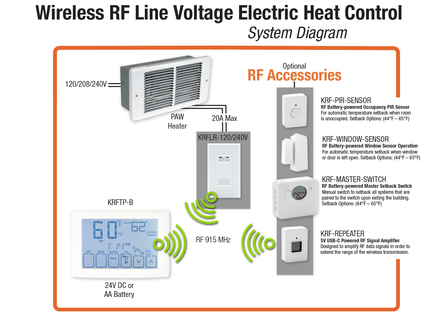 KRF-HEAT-KIT is a 24-volt RF wireless thermostat platform designed to control electric resistance heaters, including both fan-driven and baseboard models without running new wires through walls, simplifying installation. The kit includes a 7-day programmable thermostat that communicate wirelessly to a 20A 120/240V relay that is wired to the heating unit.