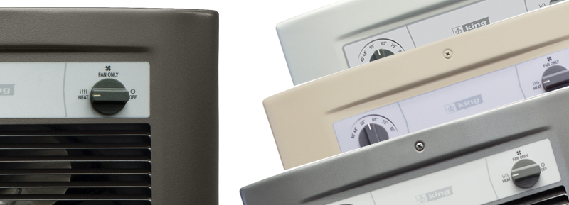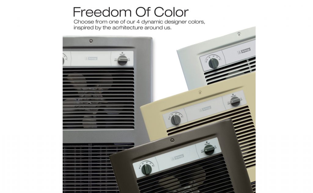 King redefines comfort with a sleek and modern new architectural design. Offering higher output than our industry leading PAW heater. King’s exclusive dual Pic-A-Watt steel fin elements allow customers to select from a range of wattage options, tailoring the heater to an area’s specific heating requirements. With up to 4500W, this is our most popular large wall heater, used in both residential and commercial applications. Standard with a 3-position Heat/Fan/OFF-DISCONNECT Switch and a fan delay to help dissipate heat from the high-mass steel plate fin elements thereby prolonging heater life and increasing energy efficiency. The high quality built-in thermostat has degrees on the label so temperature selection is easy and accurate. Now Available in 4 design colors to match any decor: White Dove, Oiled Bronze, Satin Nickel and Almondine.