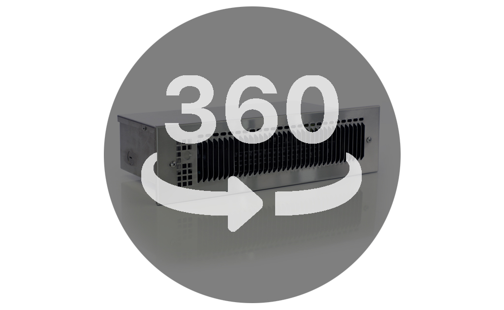 This low-profile kick space heater fits where standard heaters cannot. Stainless steel construction makes it ideally suited where corrosion resistance is needed such as marine vessels or other high humidity areas. A typical marine vessel application is mounting through a bulkhead or plywood cabinet. The oversize grill (photo) is standard. For under-counter applications check the accessories table for the appropriate grill.