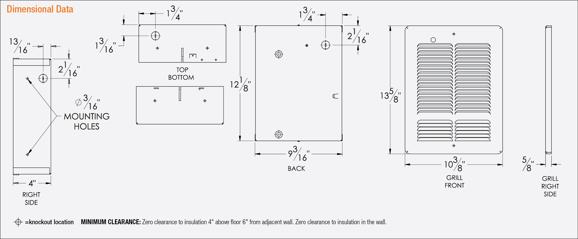 Wall Can with QuickSetTM stud alignment tabs: The wall can shall be 20 gauge electro-galvanized steel and contain knockouts through which power leads are brought. The wall can shall be able to mount directly to wall studs in new or existing construction. The wall can shall be provided with QuickSetTM stud alignment tabs, used for maintaining proper depth during new installation. The wall can shall be supplied with a factory installed ground wire. Clearance: 6” to a side wall, 4” from floor minimum. Zero clearances to insulation in the wall.