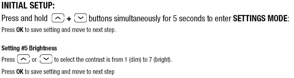 The brightness settings can be adjusted as follows. The display will be at full brightness when touched and then will dim to a predetermined level after 10 seconds. There are 6 “dim” brightness levels that can be selected, from 1-6. Level 1 is the dimmest and level 6 is the brightest. Level 4 is set as the default at the factory.