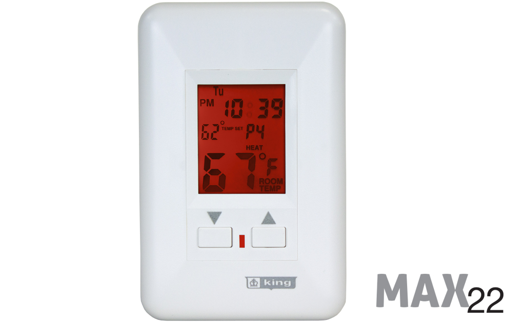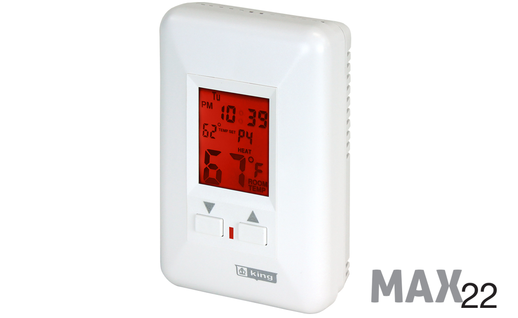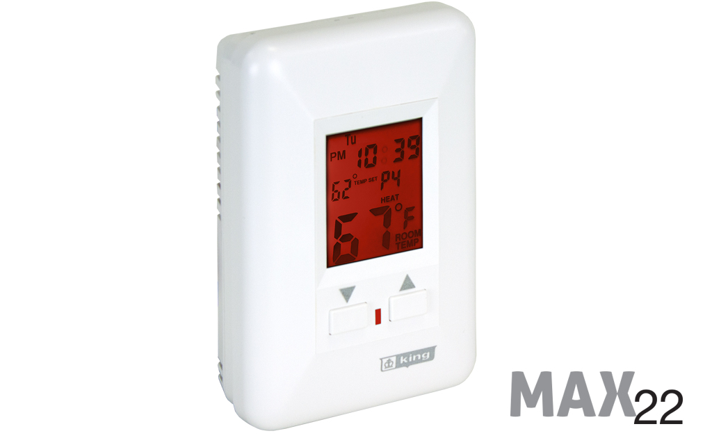 The ESP Max 22 Electronic Programmable offers “Best In Class” 22Amp Max Rating for larger heating circuits. Featuring 7 individual day programmability for maximum temperature control; four time and temperature settings. 3 wire, line powered. Large back-lit display. This thermostat took years to develop and has become a popular model. All the features you want without too many buttons. Simple is always better. We have added backlighting to the full-size display and an on/off switch to control the illumination. On the front two simple buttons control the temperature up and down, while all the programming keys are hidden under the front cover, protected from wandering, unauthorized fingers. Comfort and convenience is always our primary goal at King.