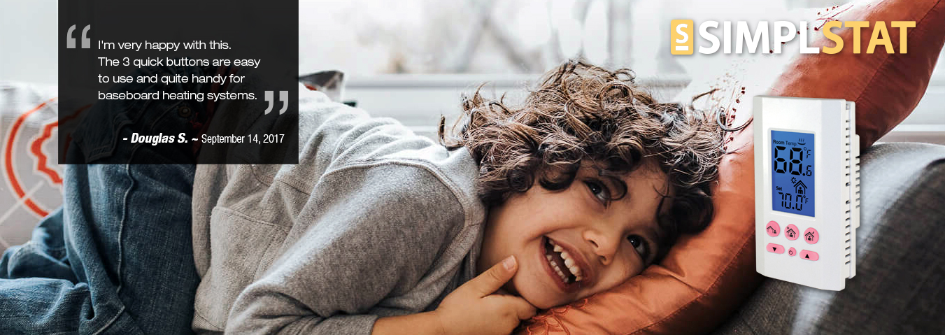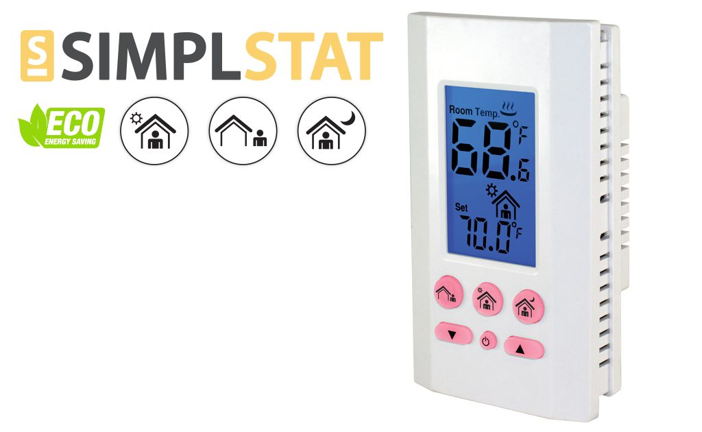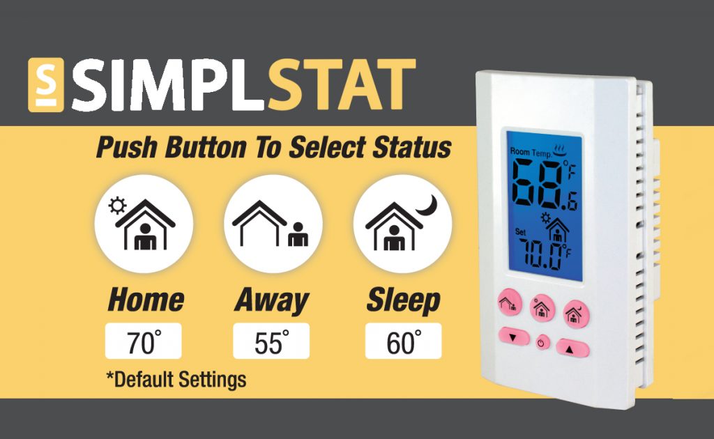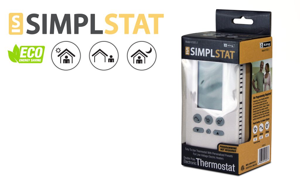 The SimplStat Electronic Thermostat with Personalized Presets. No Programming Required. Featuring a user-friendly interface of 3 oversized, back-lit preset temperature buttons that can be personalized (Home / Away / Sleep). Simply press the custom comfort preset button that applies and have confidence that the room will reach optimal temperature within minutes. Combining industry leading temperature sensing technology with a modern sleek design, King’s K700E series achieves lower energy consumption with higher comfort levels by reducing temperature swings as compared to economy models.