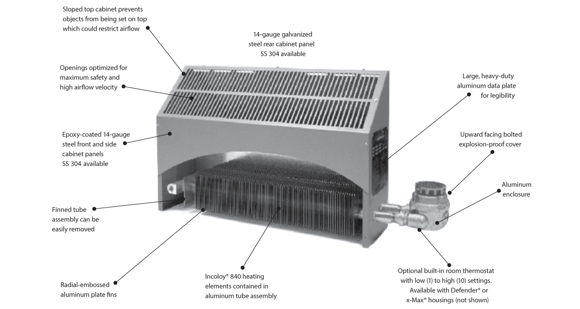 With Built-in Thermostat: XCT Defender® thermostat: Class I, Div. 1 & 2, Groups C & D; Zones 1 & 2, Groups IIA & IIB XT thermostat: Class I, Div. 1 & 2, Groups A, B, C, & D; Zones 1 & 2, Groups IIA, IIB, & IIC.