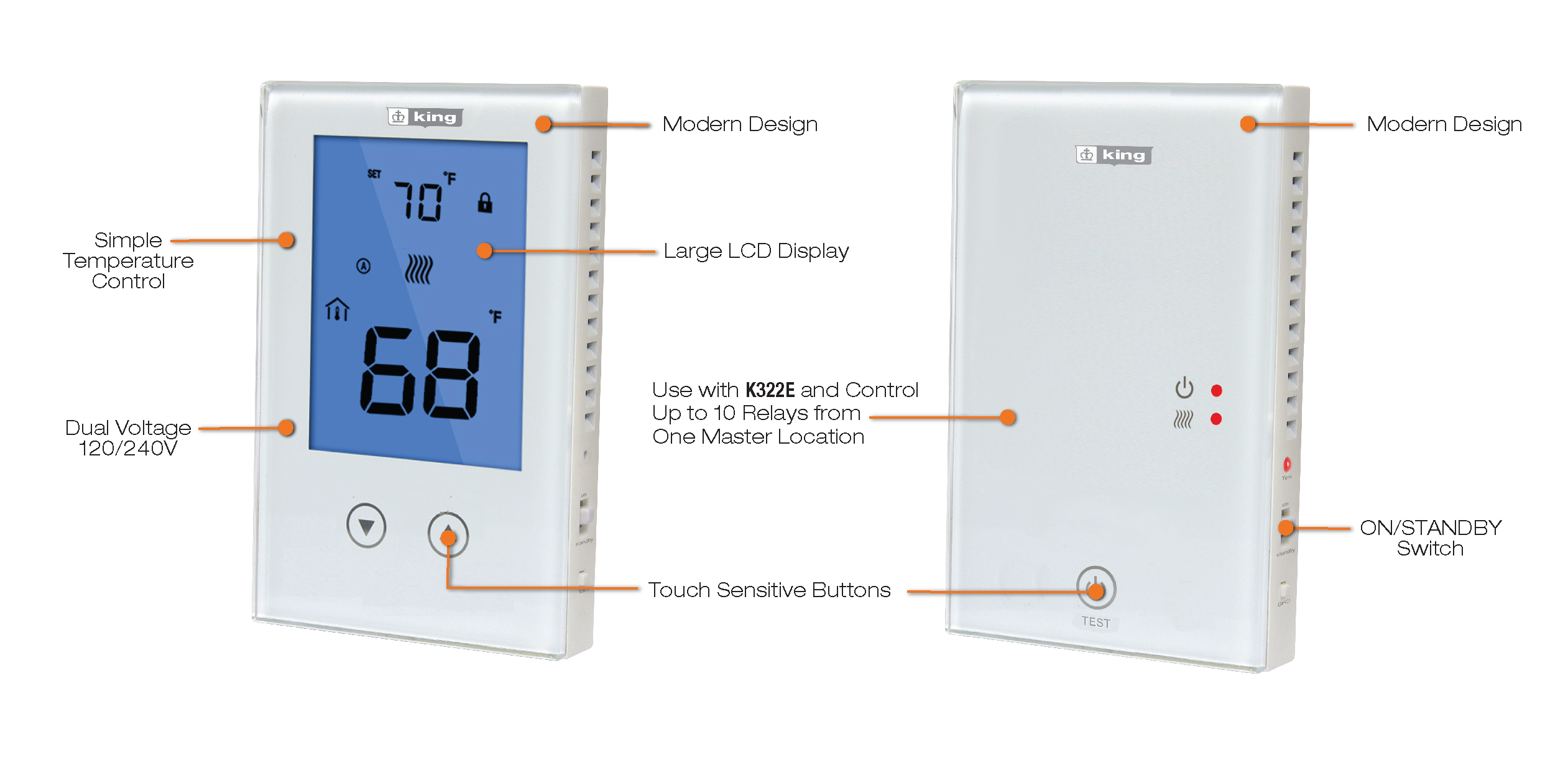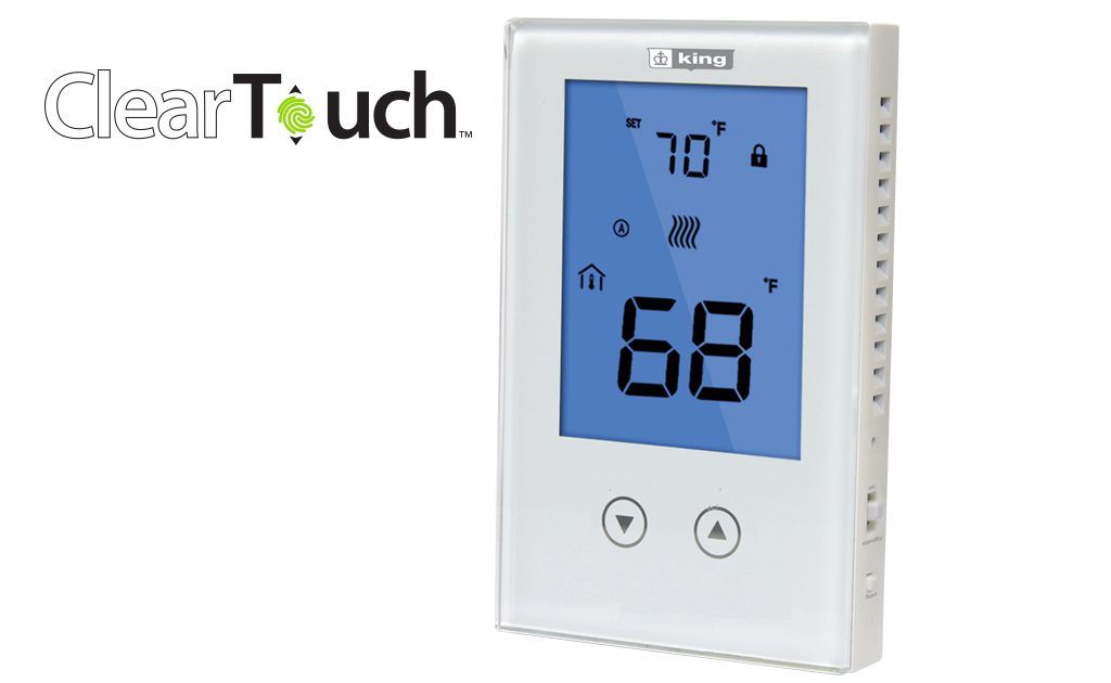 King’s ClearTouch K322E non-programmable thermostat combines user-friendly touch sensitive buttons with a sleek modern design, offering simple control of a room’s temperature. ClearTouch’s electronic sensing, provides highly accurate temperature control (±1°F, ±0.5°C) for line voltage electric heaters, saving up to 15% on your heating costs.