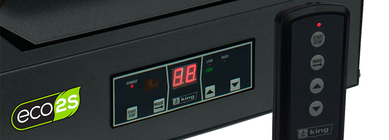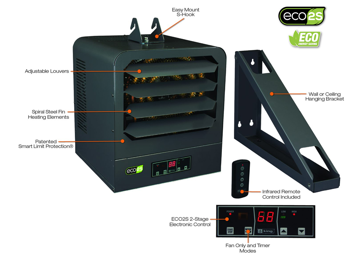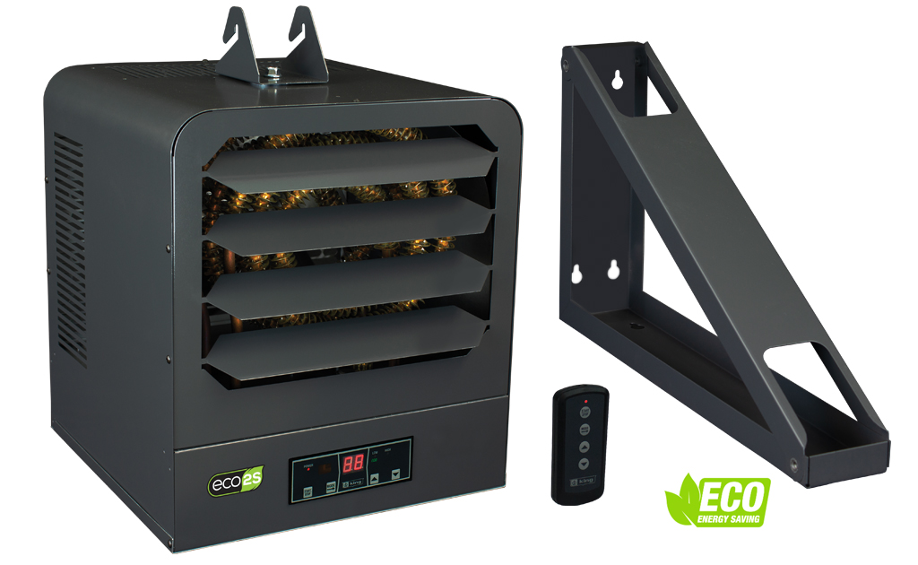 The ECO2S® KB series unit heaters offers unparalleled performance, energy efficiency and user control by incorporating another King innovation, the in-built ECO2S electronic thermostat with remote control. Offering energy efficient 2-stage heating, with Eco mode that automatically uses the lowest wattage needed to heat the room, integrated fan only and timer modes, as well as a remote control for simple operation. Designed for use as primary or supplemental heat sources in warehouses, stores or large garages spaces. Spiral steel elements and high CFM ensure even air distribution producing cooler element operation which prolongs the life of the heater. By combining the highest quality components, with a dynamically balanced fan blade, the KB ECO2S unit heater will provide years of trouble-free service and keep heating bills to a minimum. Includes universal wall/ceiling bracket for simple installation.
