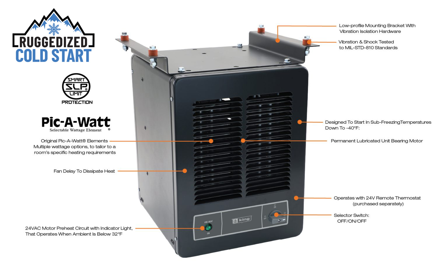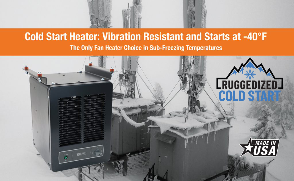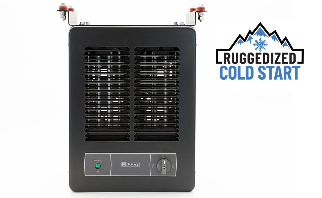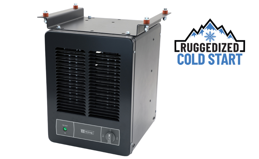 The KBP-RCS is a compact ruggedized cold start unit heater, engineered for extreme cold environments and designed to operate in sub-freezing temperatures down to -40°F. Electric Motors are difficult to start in frigid temperatures, so the King cold start heater is designed with a 24VAC heater that warms the motor before the main heating circuit and fan turns on. This 24VAC preheat circuit engages when the ambient temperature is below 32F degrees and warms up the fan motor so that it starts and runs properly.