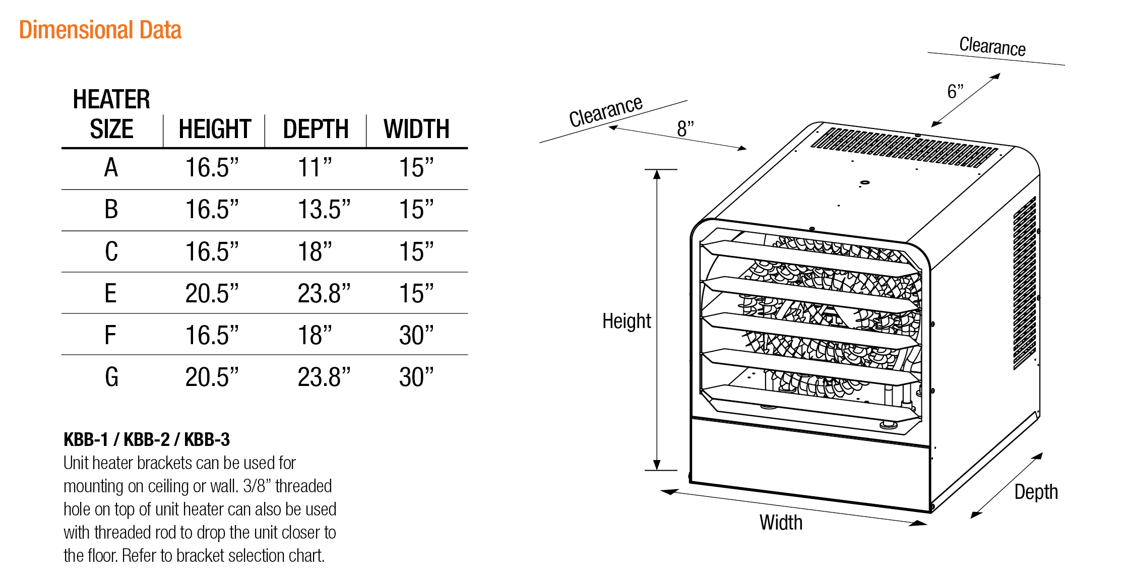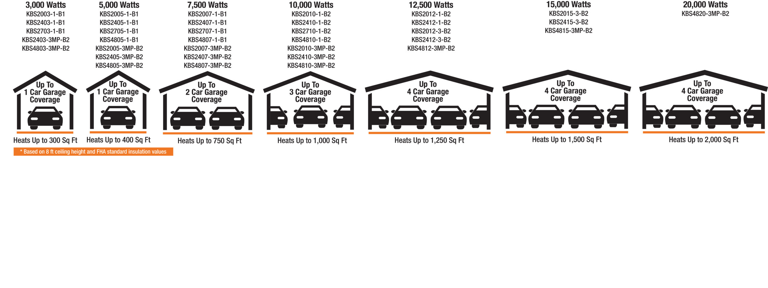 | MODEL | UPC | KW | BTUH | PHASE | VOLTS | AMPS | **THERM. CONTROL VOLTAGE | MOTOR HP | CFM | TEMP. RISE | AIR THROW | MAX. MOUNT HEIGHT | SIZE | WT. (lbs.) | Purchase |