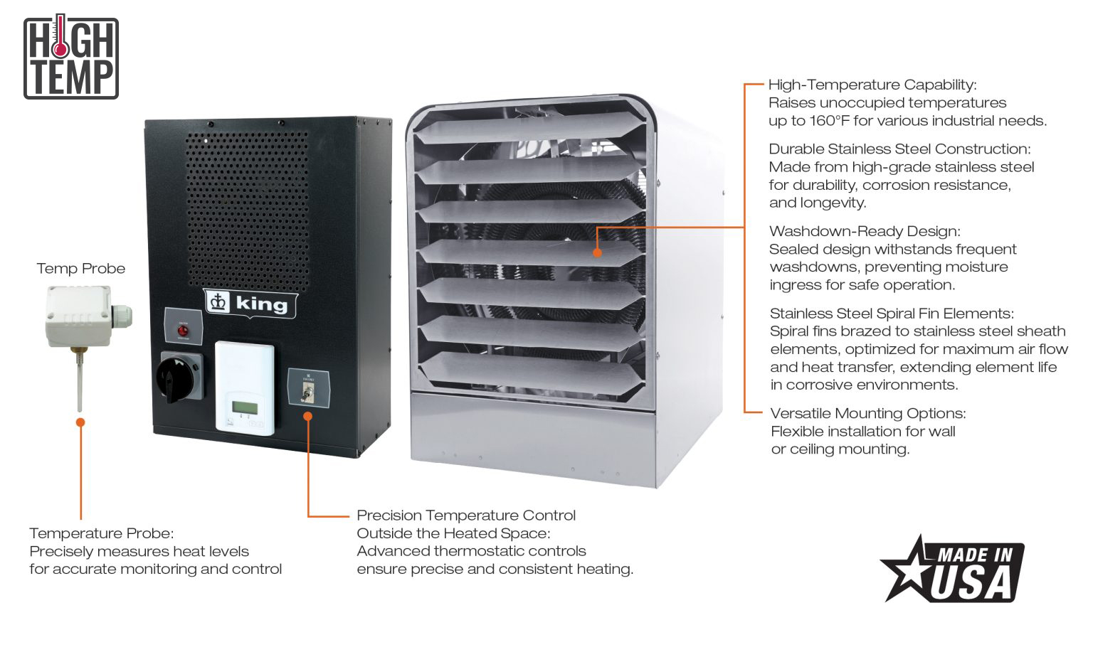 - Includes Temperature Probe That Mounts Into the Heated Space, along with the Heater