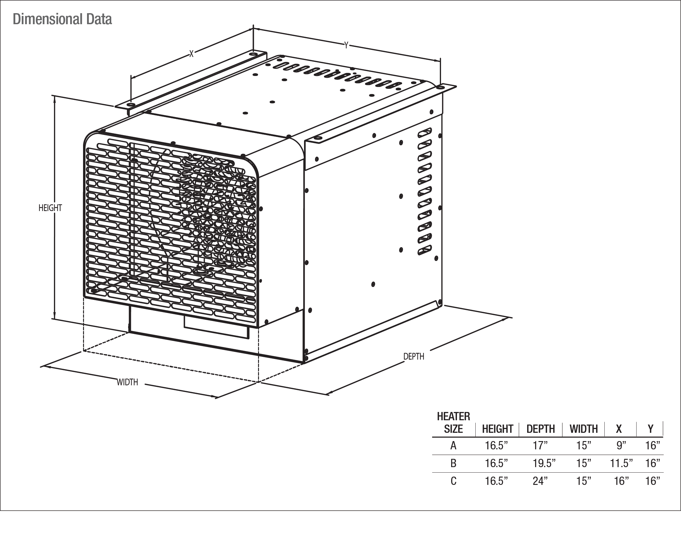 | MODEL | UPC | KW | BTUH | PHASE | VOLTS | AMPS | MOTOR HP | CFM | TEMP. RISE | AIR THROW | MAX. MOUNT HEIGHT | SIZE | WT. (lbs.) | Purchase |