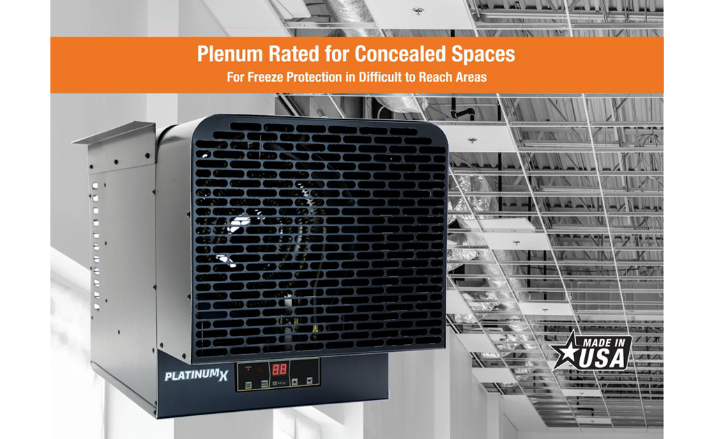 KBU PlatinumX is a zero-clearance plenum-rated freeze-protection heater approved for use in concealed areas of buildings such as an area between a finished ceiling and drop ceiling or in an open plenum. KBU PlatinumX fits seamlessly into tight spaces where warmth or freeze protection is required. It is engineered to withstand dirty, dusty, or even mildly corrosive environments, and rated for zero clearance mounting against surfaces.