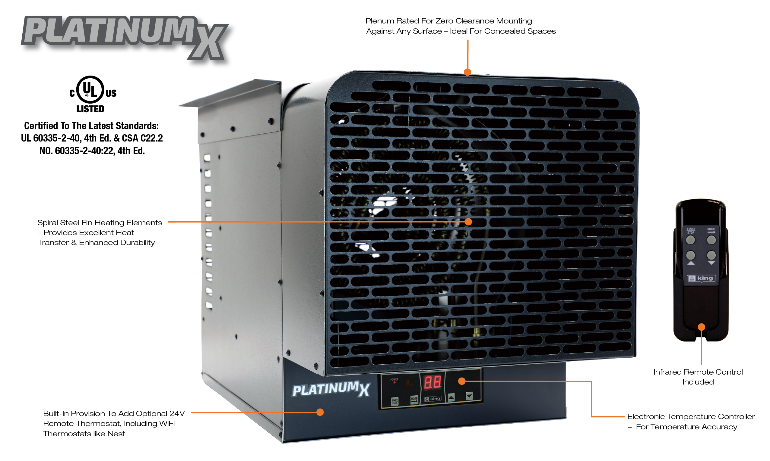 Contractor shall supply and install KBU Platinum X Series unit heaters manufactured by King Electrical Mfg. Company. Heaters shall be of the wattage and voltage as indicated on the plans.