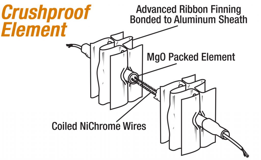 Exclusive crush-proof ribbon aluminum finning is compression welded to the heating element to provide a chimney-type flue for heat maximum transfer.