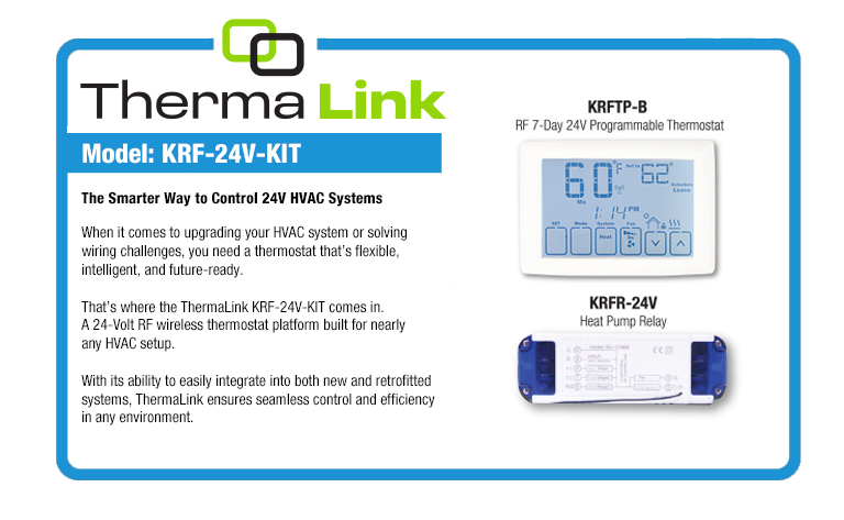 ThermaLink wireless RF thermostat is more than just a thermostat. It wirelessly controls any 24V Heat Pump or Conventional System by communicating wirelessly to a 24V relay that is wired to the HVAC unit.