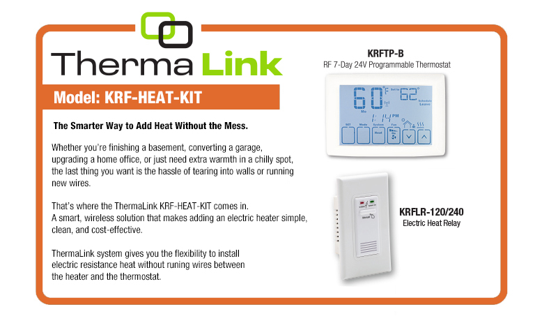 KRF-HEAT-KIT is a 24-volt RF wireless thermostat platform designed to control electric resistance heaters, including both fan-driven and baseboard models without running new wires through walls, simplifying installation. The kit includes a 7-day programmable thermostat that communicate wirelessly to a 20A 120/240V relay that is wired to the heating unit.