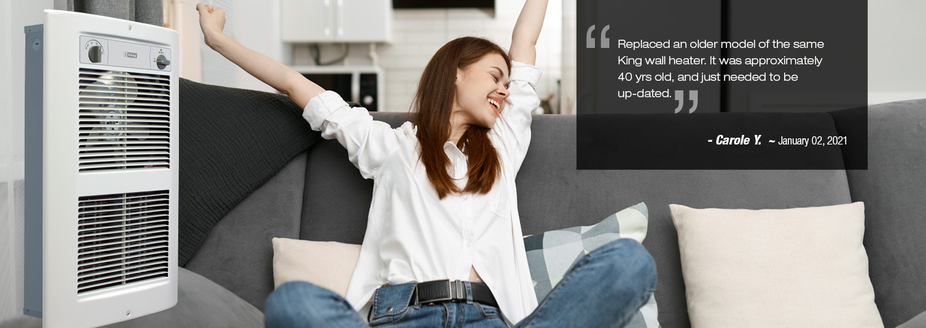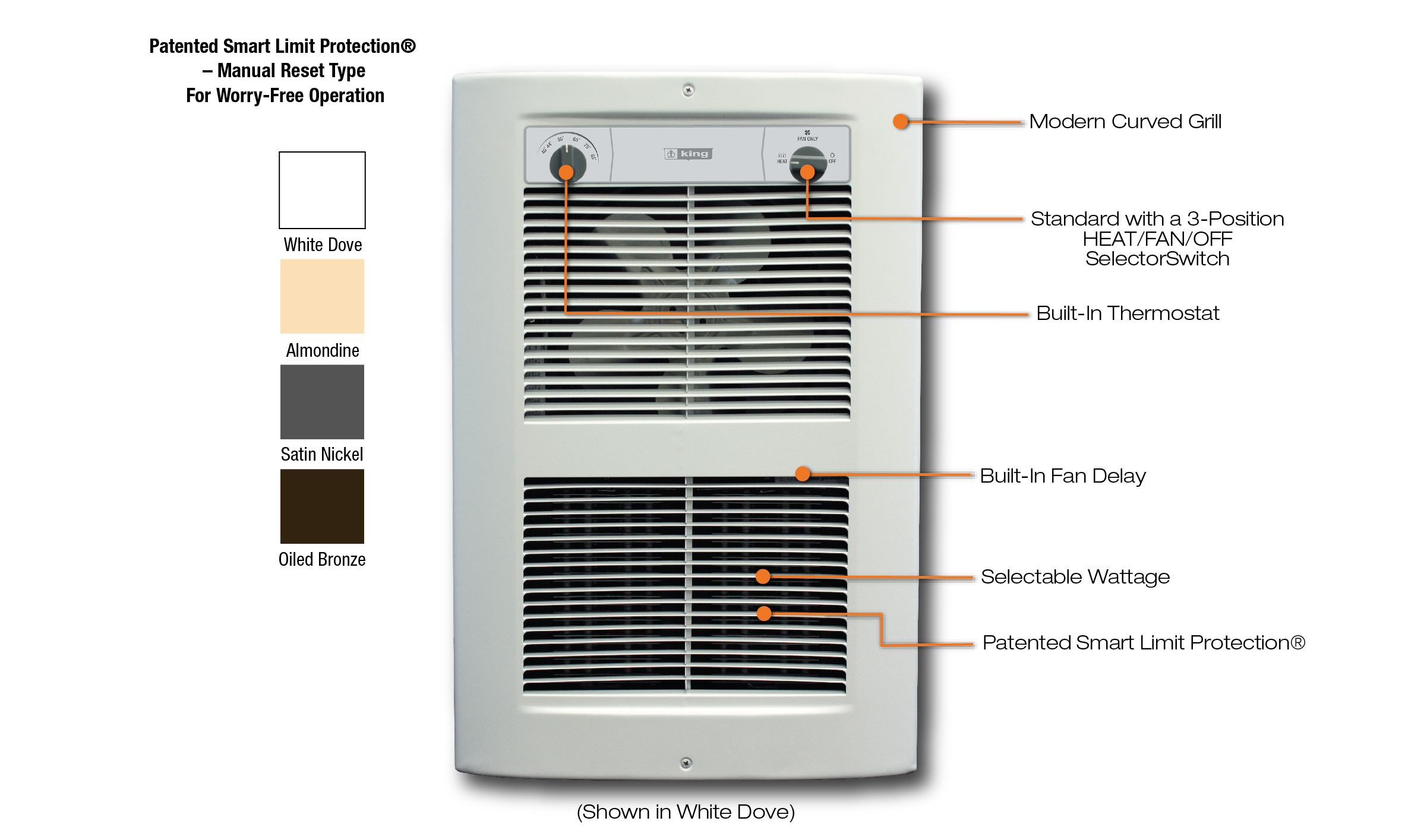 King redefines comfort with a sleek and modern new architectural design. Offering higher output than our industry leading PAW heater. King’s exclusive dual Pic-A-Watt steel fin elements allow customers to select from a range of wattage options, tailoring the heater to an area’s specific heating requirements. With up to 4500W, this is our most popular large wall heater, used in both residential and commercial applications. Standard with a 3-position Heat/Fan/OFF-DISCONNECT Switch and a fan delay to help dissipate heat from the high-mass steel plate fin elements thereby prolonging heater life and increasing energy efficiency. The high quality built-in thermostat has degrees on the label so temperature selection is easy and accurate. Now Available in 4 design colors to match any decor: White Dove, Oiled Bronze, Satin Nickel and Almondine.
