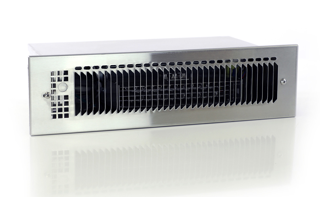 This low-profile kick space heater fits where standard heaters cannot. Stainless steel construction makes it ideally suited where corrosion resistance is needed such as marine vessels or other high humidity areas. A typical marine vessel application is mounting through a bulkhead or plywood cabinet. The oversize grill (photo) is standard. For under-counter applications check the accessories table for the appropriate grill.