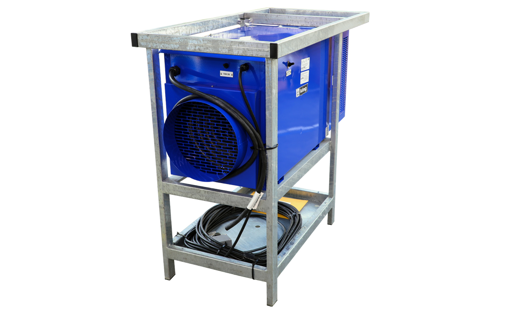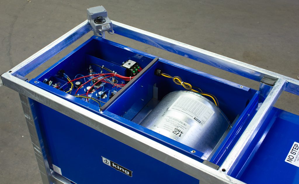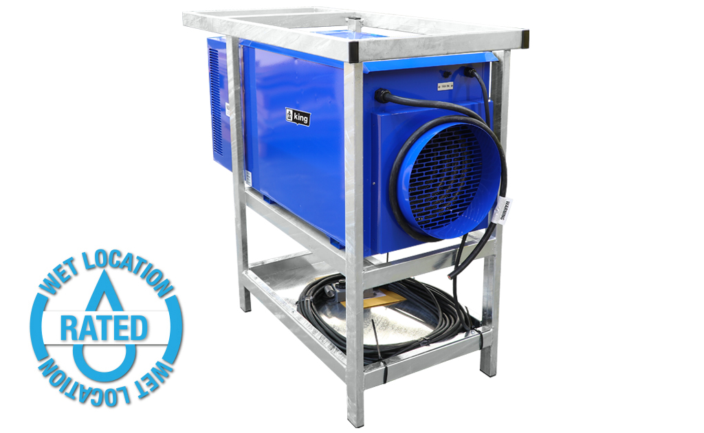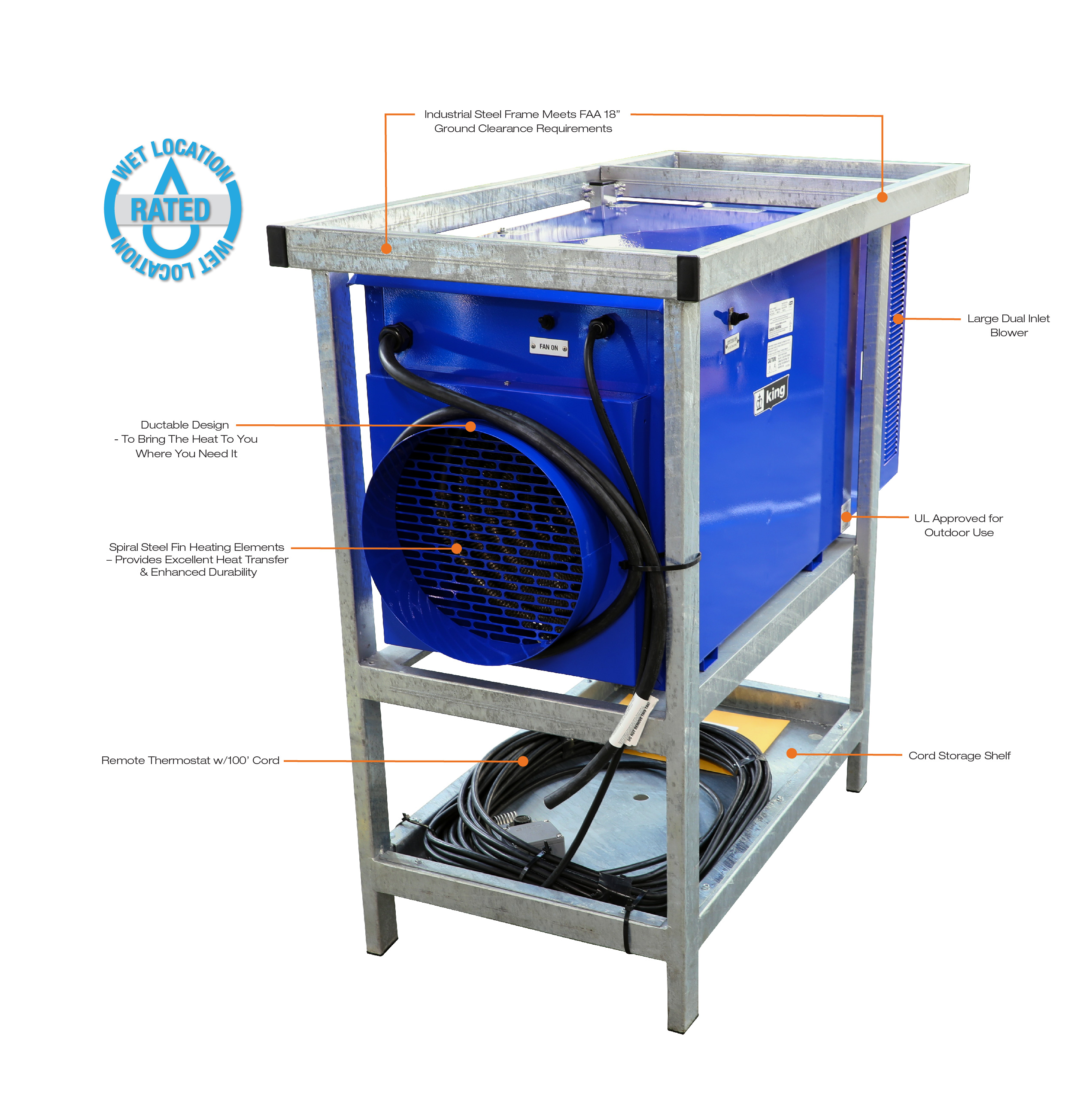 The King PCKF industrial portable heater is outdoor-rated and built to withstand the tough conditions of jobsites and industrial facilities, while also meeting FAA regulations for safe use on airport tarmacs. This unit heater is the very BEST heat source to assist in complete “Dry-out” applications, where dry electric heat is preferred to propane or kerosene space heaters. In addition, electric heat omits absolutely no odor, flame or carbon monoxide. The high CFM and moderate temperature rise are also key features to make this unit heater the very best solution for temporary large capacity heating and dry-out applications. Comes standard with a remote thermostat & 100’ cord plus a 12″ collar for adding a flexible duct to extend the heated air to where it is needed. The Industrial Steel Frame complies with the FAA’s Airport regulations of 18 inch above the ground for air inlet of the heater to reduce the jet fuel vapor being drawn in. This outdoor rated portable unit heater allows you to place the heater outside in the rain and feed heated air into a building structure, plane, container, apartment, ship or any work area requiring heated dry fresh air and not take up space in the work area. Includes an intake rain baffle and electrical compartment rain cover and is UL approved for Outdoor Use.