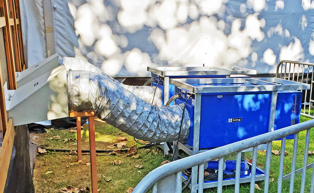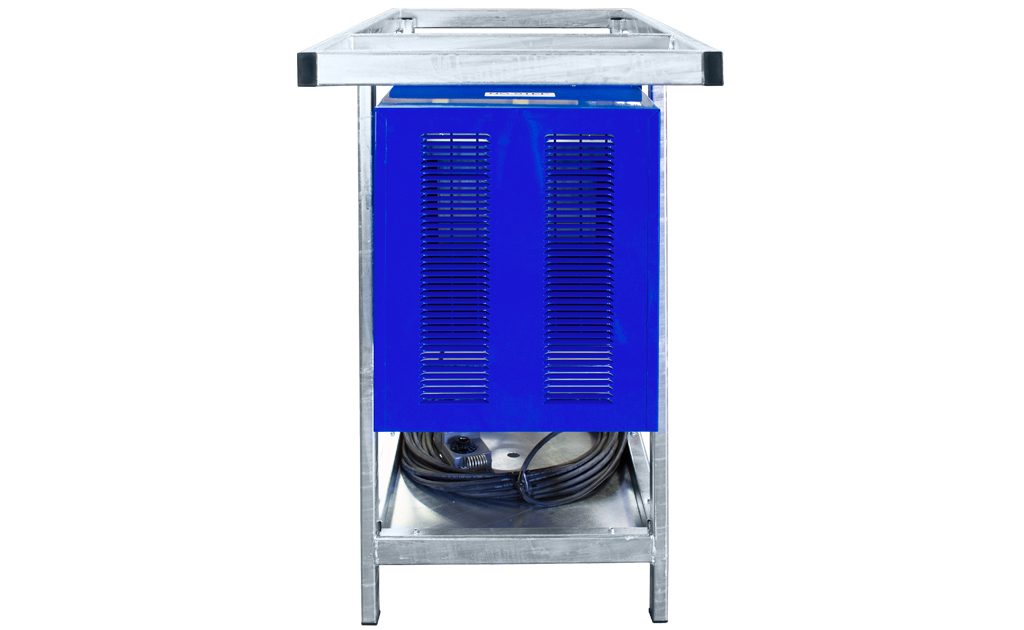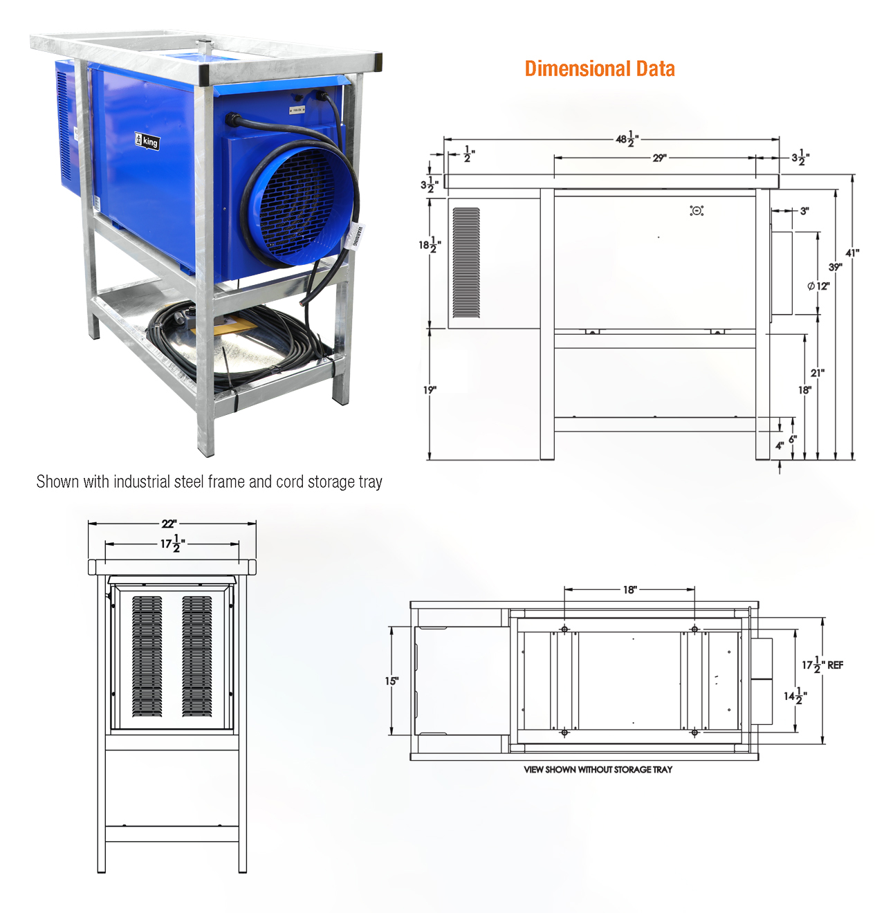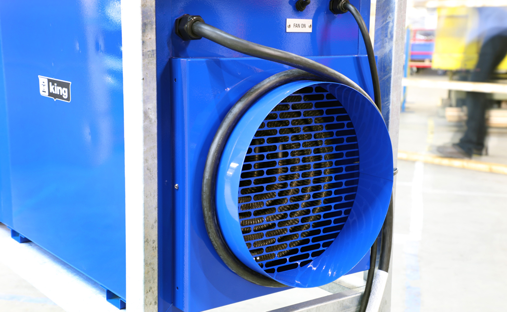 The King PCKF industrial portable heater is outdoor-rated and built to withstand the tough conditions of jobsites and industrial facilities, while also meeting FAA regulations for safe use on airport tarmacs. This unit heater is the very BEST heat source to assist in complete “Dry-out” applications, where dry electric heat is preferred to propane or kerosene space heaters. In addition, electric heat omits absolutely no odor, flame or carbon monoxide. The high CFM and moderate temperature rise are also key features to make this unit heater the very best solution for temporary large capacity heating and dry-out applications. Comes standard with a remote thermostat & 100’ cord plus a 12″ collar for adding a flexible duct to extend the heated air to where it is needed. The Industrial Steel Frame complies with the FAA’s Airport regulations of 18 inch above the ground for air inlet of the heater to reduce the jet fuel vapor being drawn in. This outdoor rated portable unit heater allows you to place the heater outside in the rain and feed heated air into a building structure, plane, container, apartment, ship or any work area requiring heated dry fresh air and not take up space in the work area. Includes an intake rain baffle and electrical compartment rain cover and is UL approved for Outdoor Use.