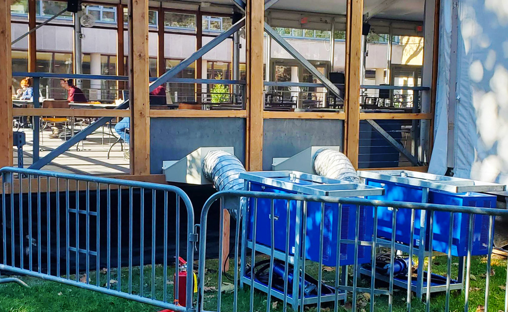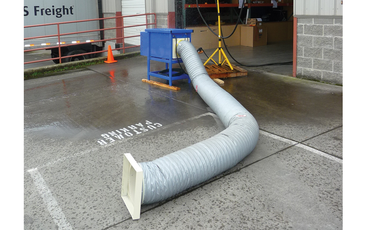 The PCKF can be placed outside in the rain and feeds heated air into a building structure, plane, container, apartment, ship or any work area requiring heated dry fresh air and not take up space in the work area.