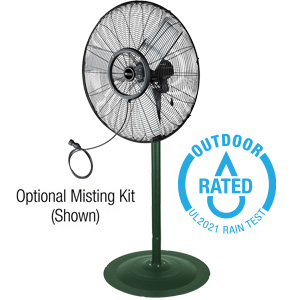 King Commercial High Velocity Outdoor Rated Oscillating Air Circulators are a powerful commercial-grade solution for cooling workshops, warehouses, factories, gyms and more. This oscillating fan motion distributes airflow in a 80 degree sweeping motion or disengage for manual desired, hand positioning. The waterproof, totally enclosed motor is outdoor rated for wet locations and offers 3-speeds. Featuring 3 aerodynamically balanced aluminum blades for even, steady airflow and to provide maximum air and motor efficiency. The scratch resistant King green finish looks sharp and is easy to clean. Height adjustable from 57” to 75” to direct the air flow where you need it most.