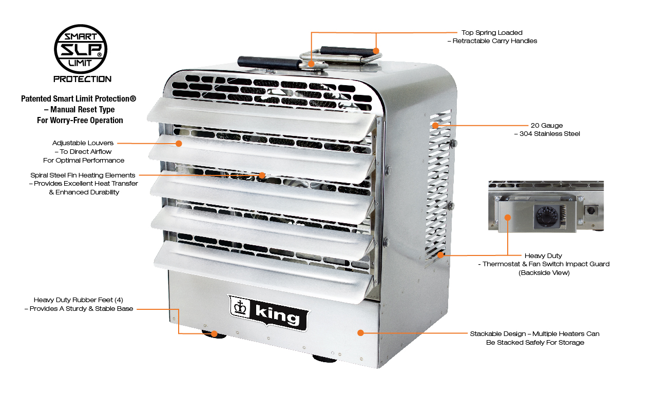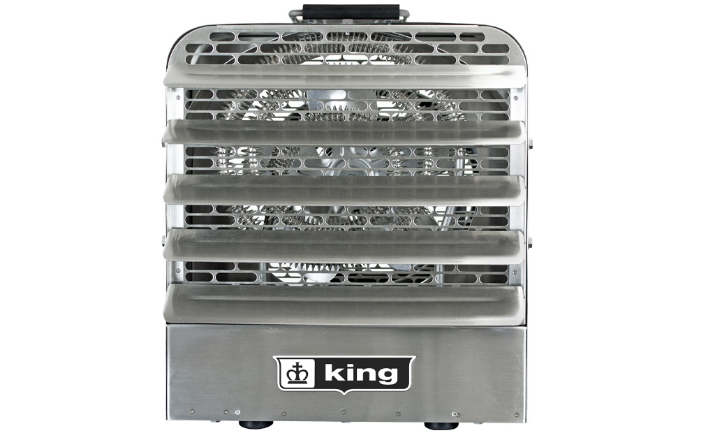Thermal Overload: Heaters shall be equipped with King’s patented thermal overload Smart Limit Protection®, which disconnects elements and motor in the event normal operating temperatures are exceeded. If thermal overload trips due to abnormal operating temperatures, thermal overload shall remain open until manually reset by turning the heater off for 15 minutes. Automatically reset of thermal overloads, which allow the element to continue to cycle under abnormal conditions, will not be accepted.