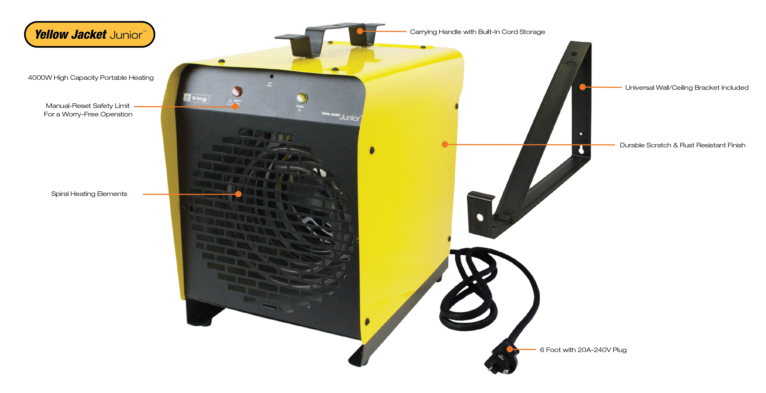 The PSH Yellow Jacket Junior is a 3750W high power portable heater designed to provide a back-up heating source at an affordable price. Perfectly suited for the workshop, garage or construction sites. The convenient 6 foot cord allows greater mobility to areas needing heating, while the handle serves as a reel for the cord when not in use. Easily set the desired temperature with the built-in thermostat. Sure stop high-limit temperature control with manual reset provides overheat protection. With a 300 CFM fan, heat is dispersed efficiently.