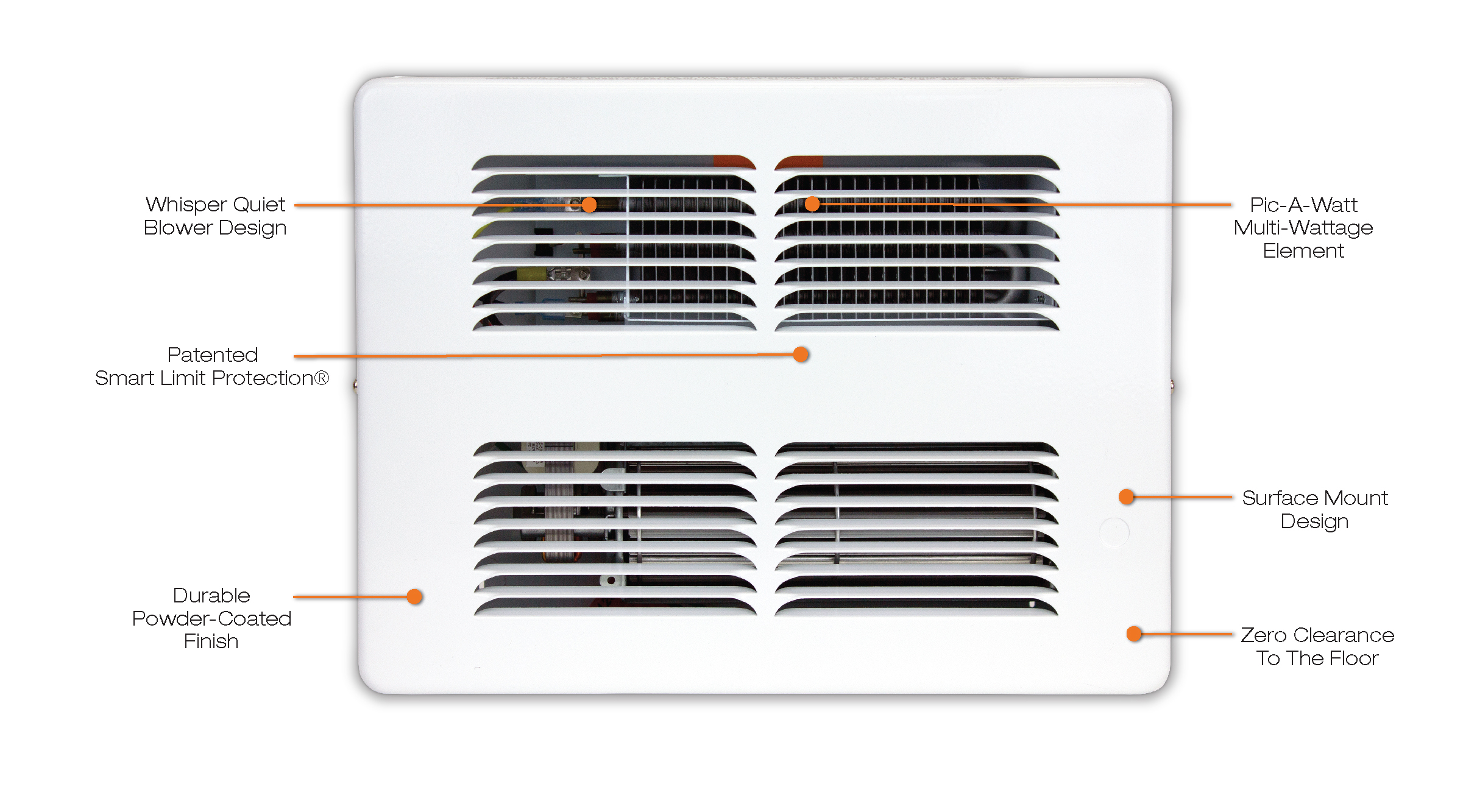 in contact with the finished floor (unlike other fan heaters that require to be installed at least 4″ above the floor). The Pic-A-Watt® feature allows a customers to select from a range of wattage options, tailoring the heater to an area’s specific heating requirements.