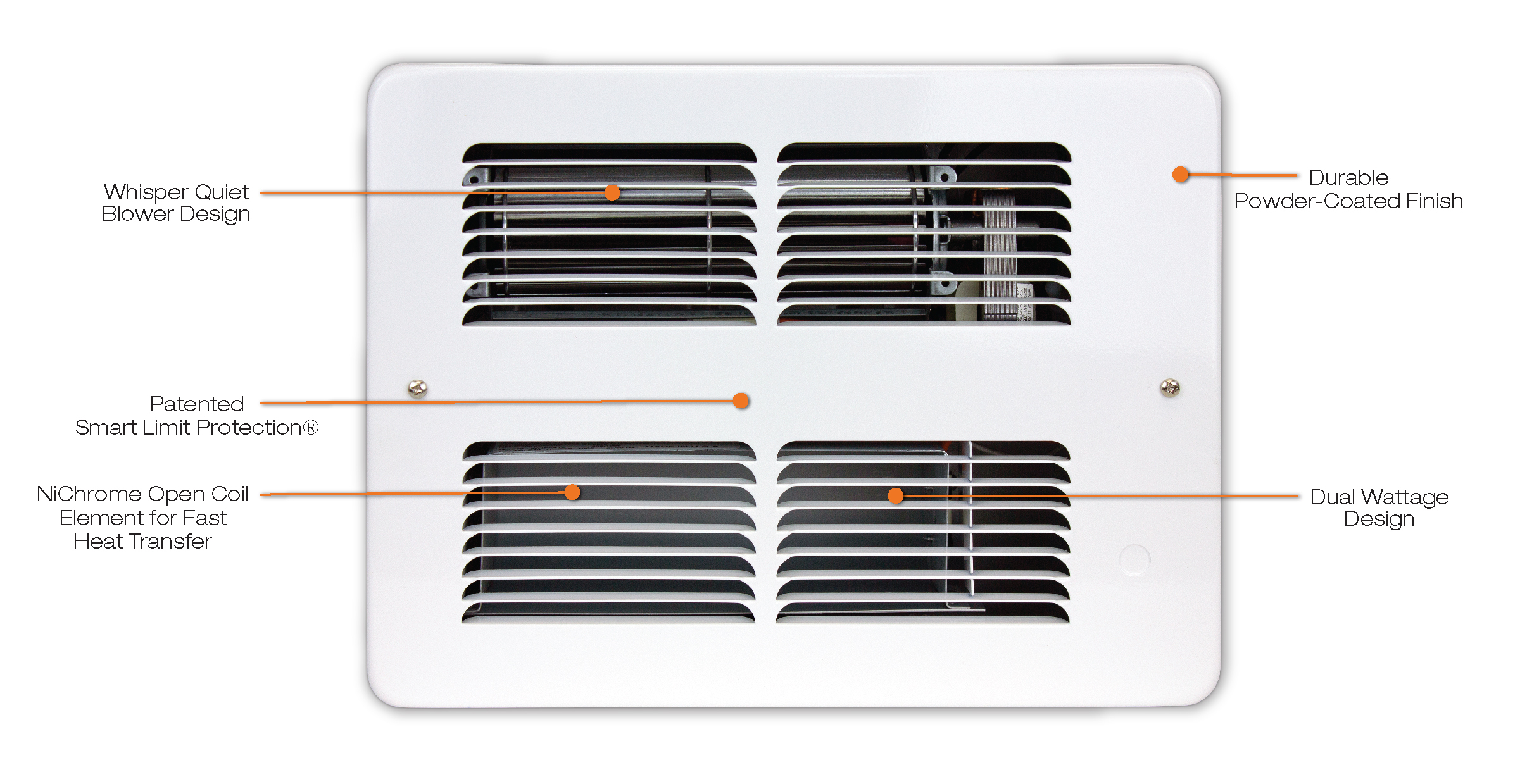The WHF heater offers extreme value by combining the rapid heat transfer of a NiChrome element with the performance of a squirrel cage blower. This makes for a relatively quiet heater without the added cost of a high mass element like the Pic-A-Watt®. It is commonly used as the first upgrade in apartment construction and is an excellent choice for bathrooms because of the instant heat from the wire element.